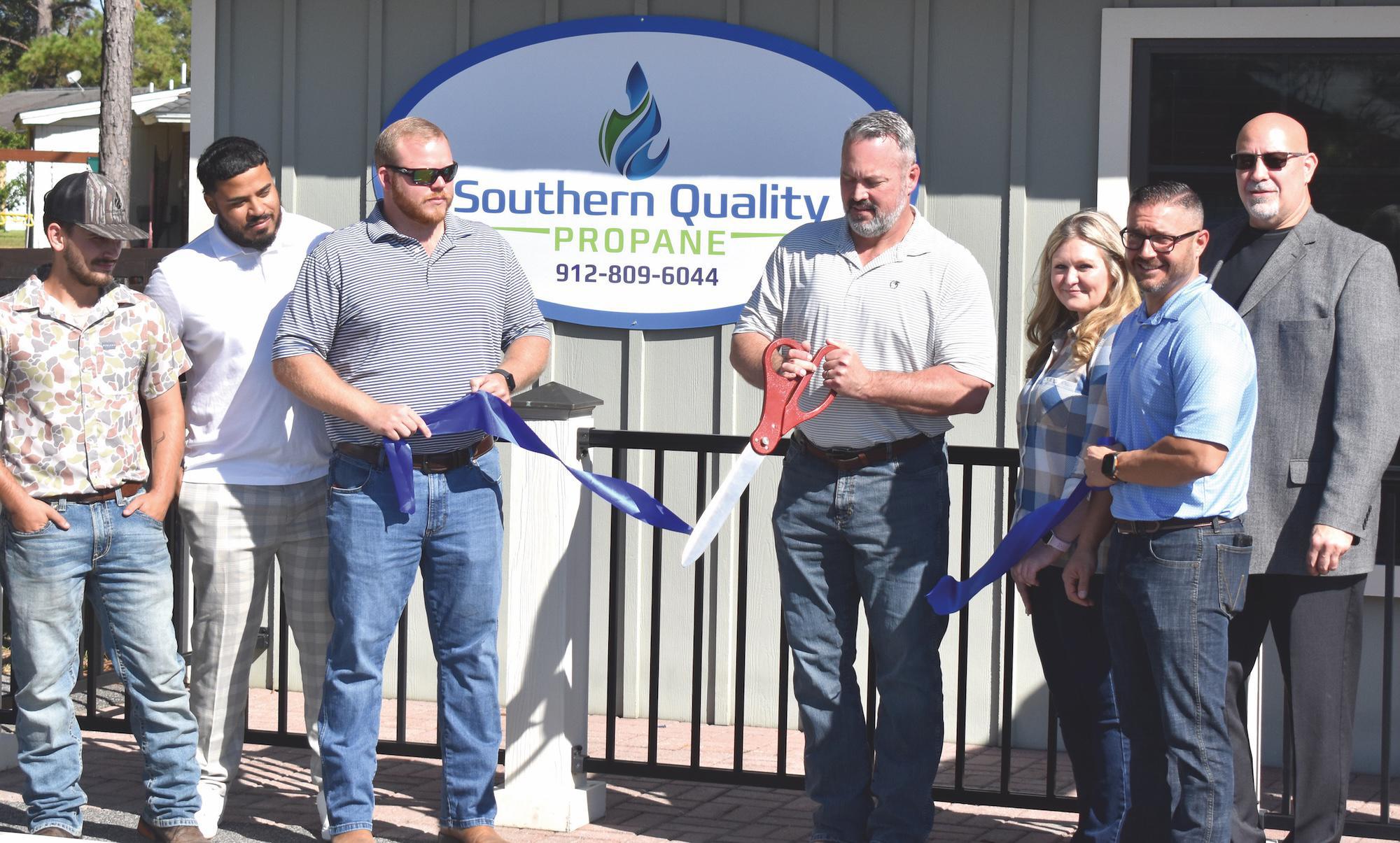 Southern Quality Propane cut the ribbon at their newest location on Oct. 21. Based out of Thomasville, Southern Quality Propane now has five locations, three in Georgia and two in Florida. Brian Owens is the branch manager of the new Blackshear location, which is the newest member of the Pierce County Chamber of Commerce. Free hamburgers and hotdogs, along with raffle prizes, helped celebrate the ribbon cutting. Pictured above (l-r) are Micah Freeman, Anthony Garcia, Trae Kicklighter, Brent Henson, Bridgette Owens, Brian Owens, and Tony Gilbert.